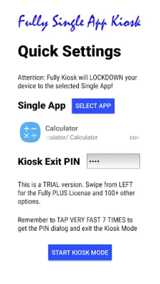 This is a UNLIMITED TRIAL VERSION. Fully Single App Kiosk supports Android 5 to 14. No root required. For Android 8+ we however recommend using device provisioning for better protection. Check our website for instructions.